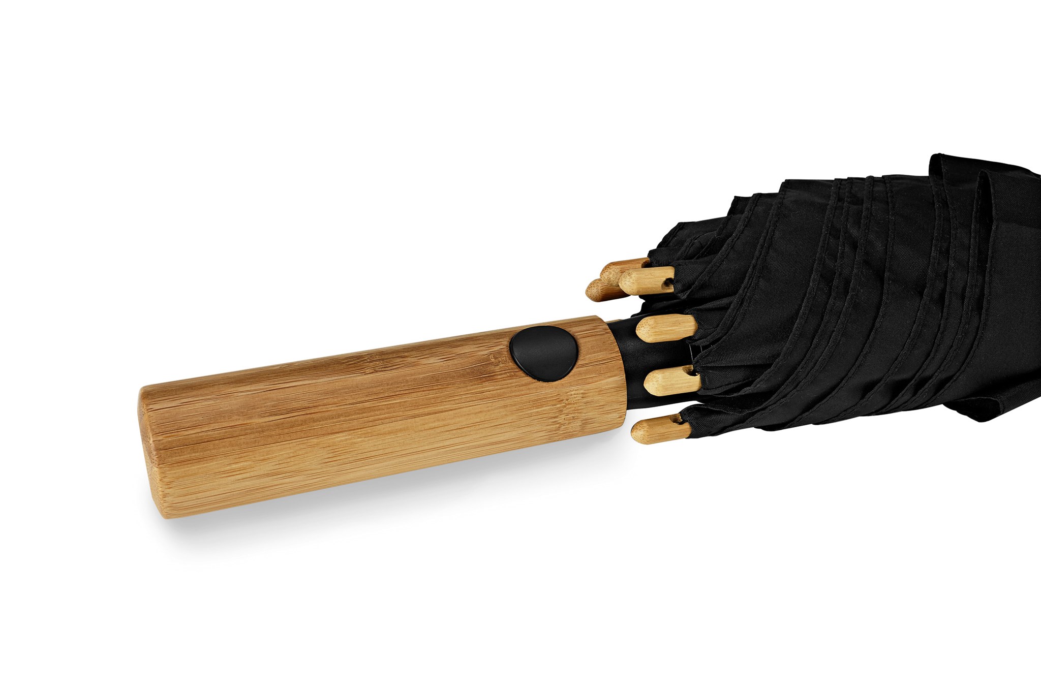 Avtomatski dežnik z ročajem iz bambusa. Majhen odsevni tisk motorne žage STIHL v srebrni barvi na vsakem drugem segmentu, priročna avtomatska funkcija za hitro odpiranje, visokokakovosten sistem zaščite pred vetrom in ogrodje iz steklenih vlaken za največjo prilagodljivost okvirja pri močnih sunkih vetra.