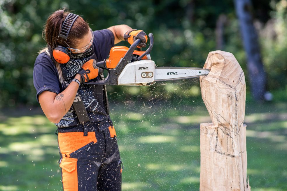 Pri delu z motorno žago, tudi če delate samo kot priložnostni umetnik, potrebujete ustrezna zaščitna oblačila. Sem med drugim spadajo hlače z zaščito pred rezi, zaščitna obutev, zaščita sluha, zaščitna očala in rokavice iz trpežnega materiala. Več podrobnosti najdete v navodilih za uporabo svoje motorne žage.