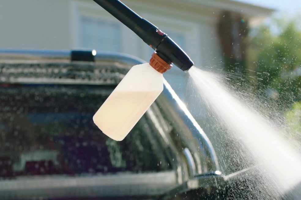 Zdaj začnite s čiščenjem avtomobila z visokotlačnim čistilnikom. Uporabite ploščato šobo in začnite z najmanjšim pritiskom. Zagotovite minimalno razdaljo 30 cm od avtomobila, da ne poškodujete laka in občutljivih gumijastih delov. Curek naj ob avtomobil udarja pod ostrim kotom in sperite grobo umazanijo. Tudi platišča in pnevmatike lahko previdno očistite z visokotlačnim čistilnikom. Pri tem v dele avtomobila iz gume ne usmerite neposrednega vodnega curka.