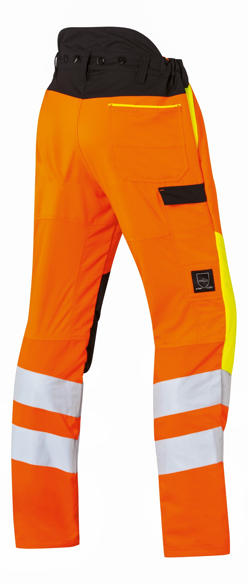 Robustne hlače iz funkcijske mešanice materialov. V signalni oranžni, signalni rumeni ter črni barvi. Zračen material na zadnji strani stegen, robusten material v predelu kolen in spodnjem delu nog. Dva stranska žepa, žep na sedalu, žep za zložljivi meter, zaščita ledvic, oprsnik na gumbe z žepom in podaljšanim zadnjim delom za zaščito pred podhladitvijo.