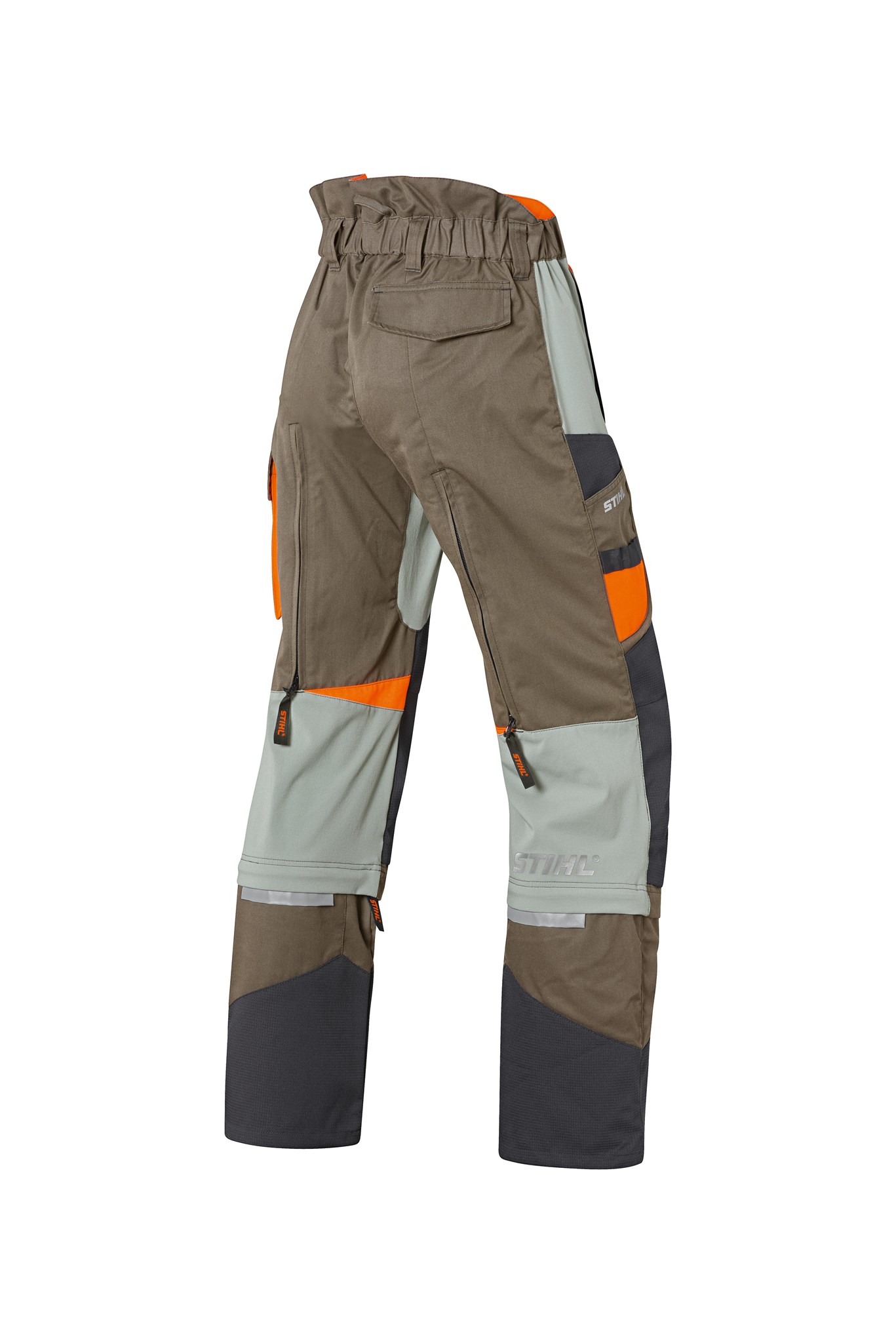 Idealne za delo z rezalniki za živo mejo. Rjave barve z zaščito ledvic. S hlačami lahko uporabite tri dodatne zaščite in sicer zaščito nog HS 2 v 1, blazine za kolena ter zaščito nog FS. Elastični material zagotavlja optimalno svobodo pri gibanju, tkanina na kolenih in robovih odbija vodo. Dolge prezračevalne zadrge na zadnji strani skrbijo za odlično zračenje. Hlačnice se lahko odpnejo na ¾ dolžine. Zunanja tkanina: 65% poliester, 35% bombaž. Podloga: 100% poliester.