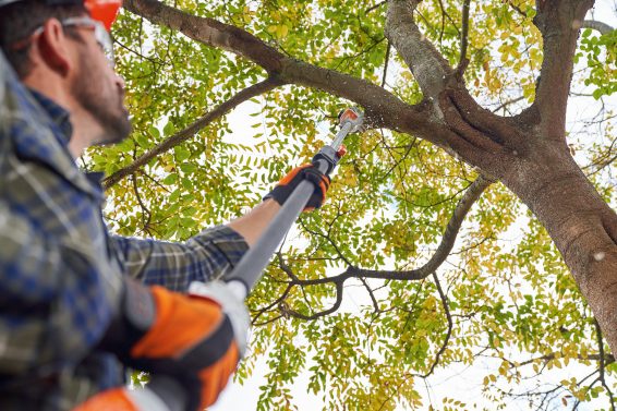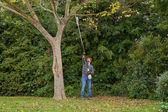Pri žaganju na višji višini je pomembno, da delovne naprave, npr. višinski obvejevalnik STIHL HTA 50, vpnete na nosilni pas. Tako je naprava pritrjena in ne more pasti na tla. Seveda veljajo enaka pravila za žaganje/rezanje kot pri obrezovanju drevja v spodnjem delu debla.Nikoli ne delajte pod vejo. Ko ste odžagali vejo, jo najprej odvlecite stran od drevesa, šele nato nadaljujte z delom.