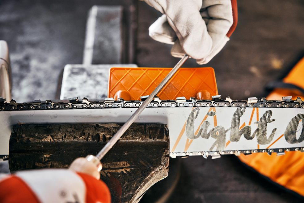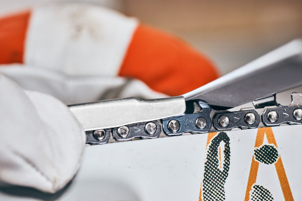Verigo ostrite vedno tako, da je pila nastavljena pravokotno (kot 90°) na meč. Pila naj »zagrabi« samo pri potisku naprej, pri povratnem gibu pilo dvignite. Pilo v rednih razmakih nekoliko obrnite, da preprečite enostransko obrabo.