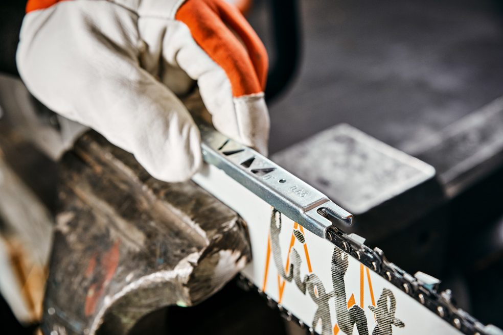 V naslednjem koraku temeljito očistite verigo in preverite, ali je morda poškodovana. Pred ostrenjem verigo nekoliko bolj napnite. Pri ostrenju je lahko bolj napeta kot pri običajnem delu. Tako boste lažje naostrili zobe, poleg tega se bodo pri postopku ostrenja manj premikali. Izberite primerjalni zob in ga označite s flomastrom. Ta bo služil za primerjavo za naslednje zobe. Pazite, da še niste dosegli oznake za obrabo. V nasprotnem primeru priporočamo zamenjavo verige.