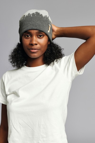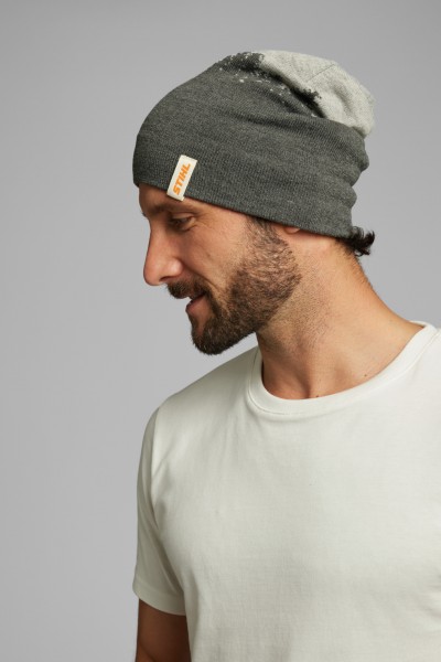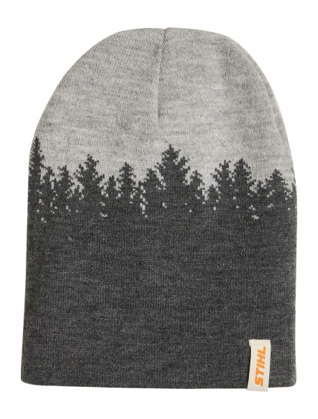 Fino pletena kapa z vzorcem silhuete gozda in našitkom STIHL ob strani.