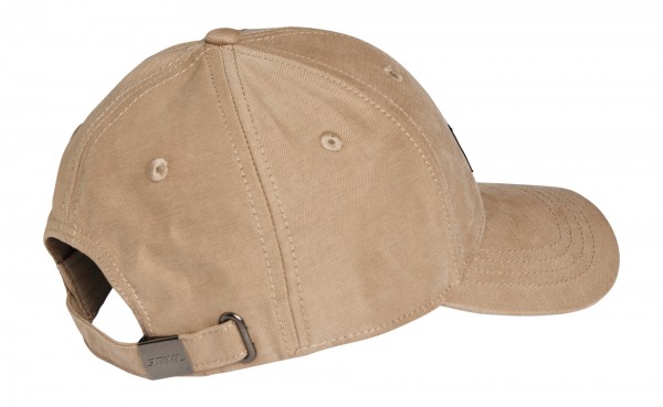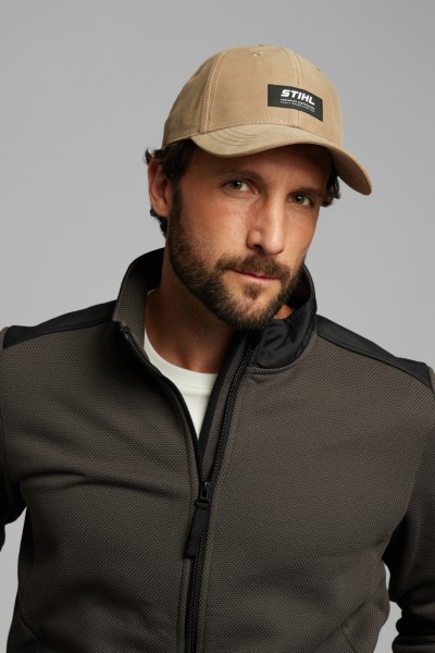 Kovinska zaponka vam omogoča individualno nastavitev velikosti. V kovino je vtisnjen logotip STIHL. Na sprednji strani črn našite z logotipom STIHL in napisom »LEGENDARY PERFORMANCE«.