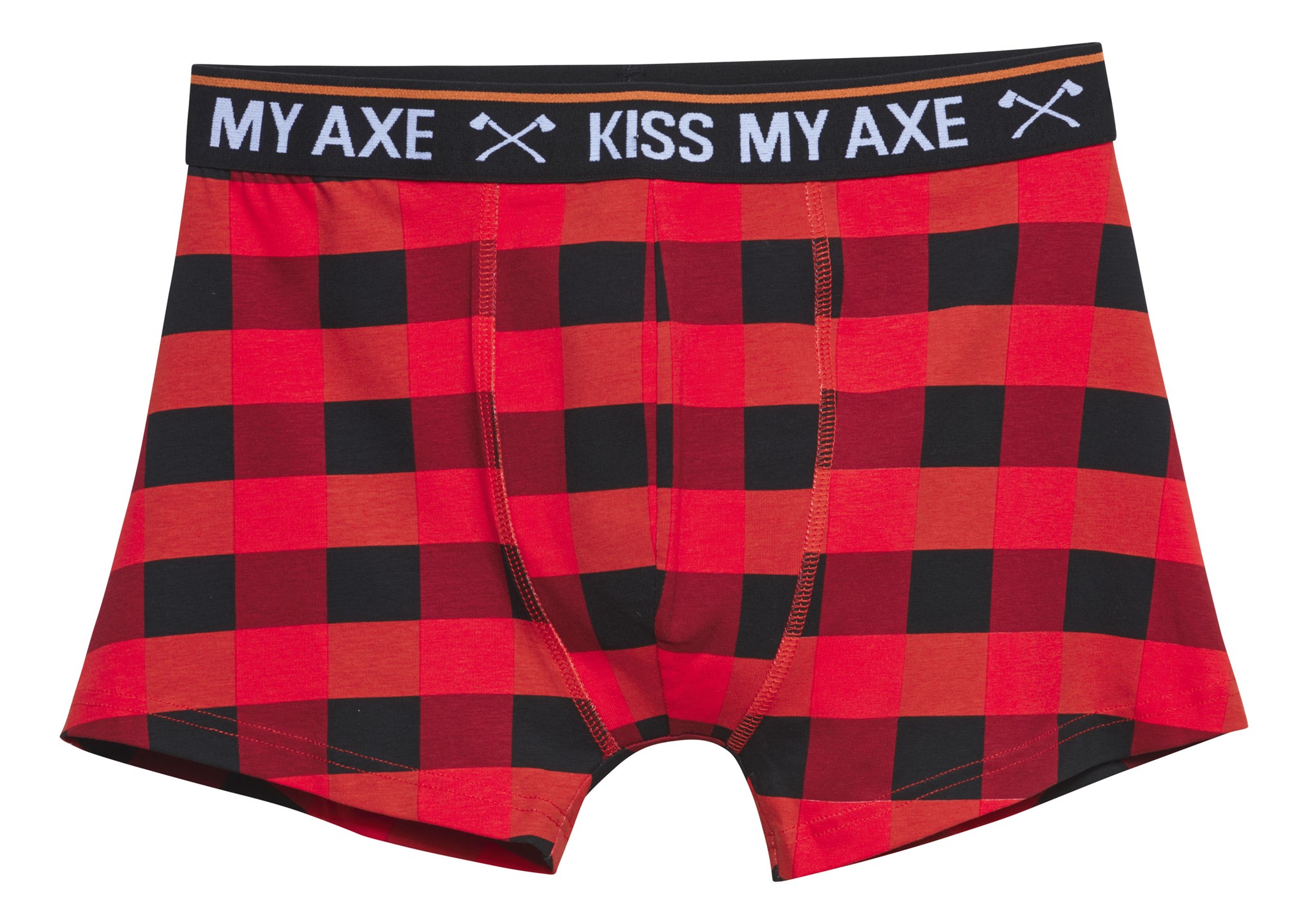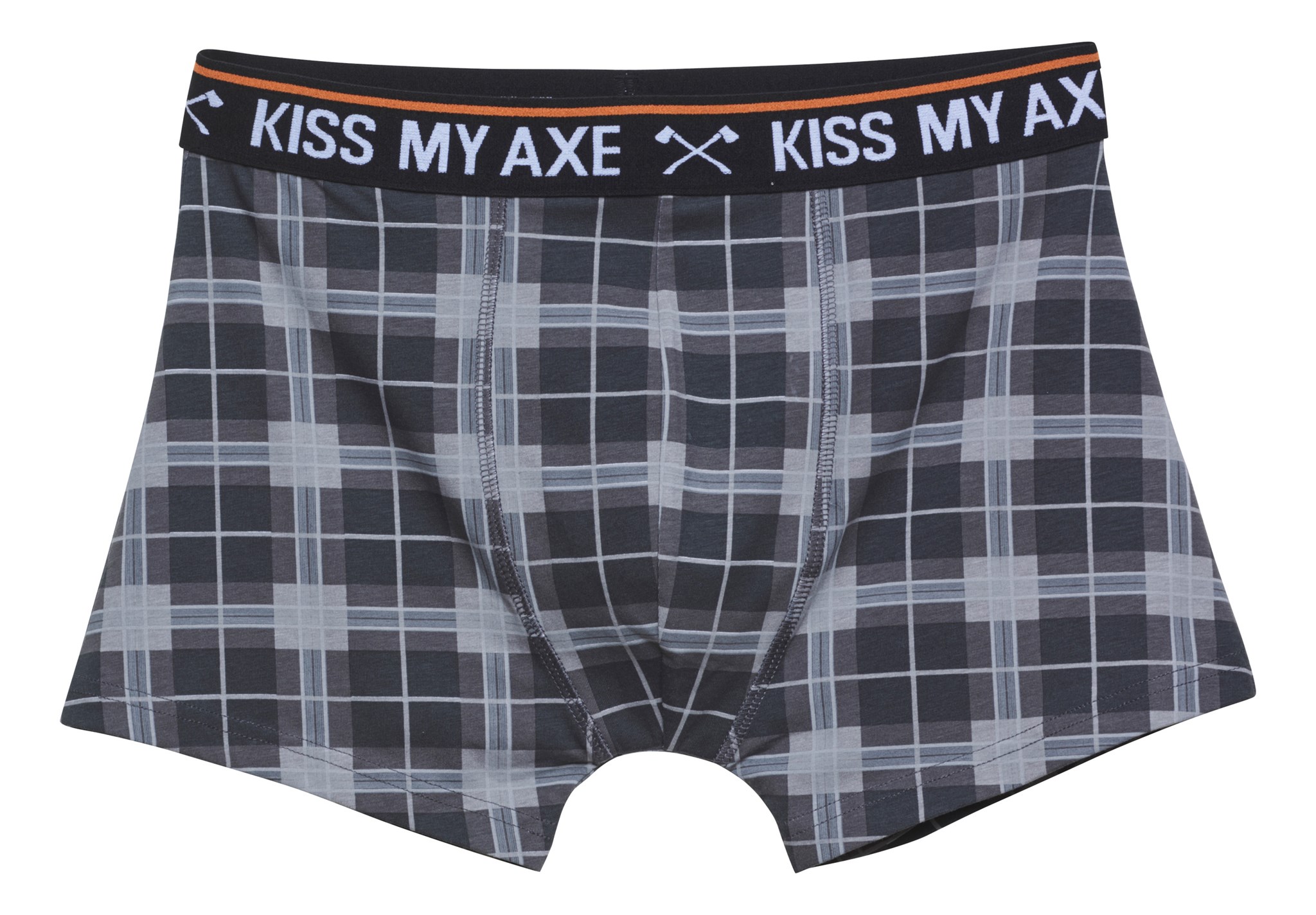Klasika zdaj v karirasti preobleki. Boksarice iz 100% bombaža so na voljo v dveh različnih črno / rdečih preverjenih barvnih izvedbah. Napis KISS MY AXE na elastičnem pasu zaokroži dizajn. 2 kom v kompletu.