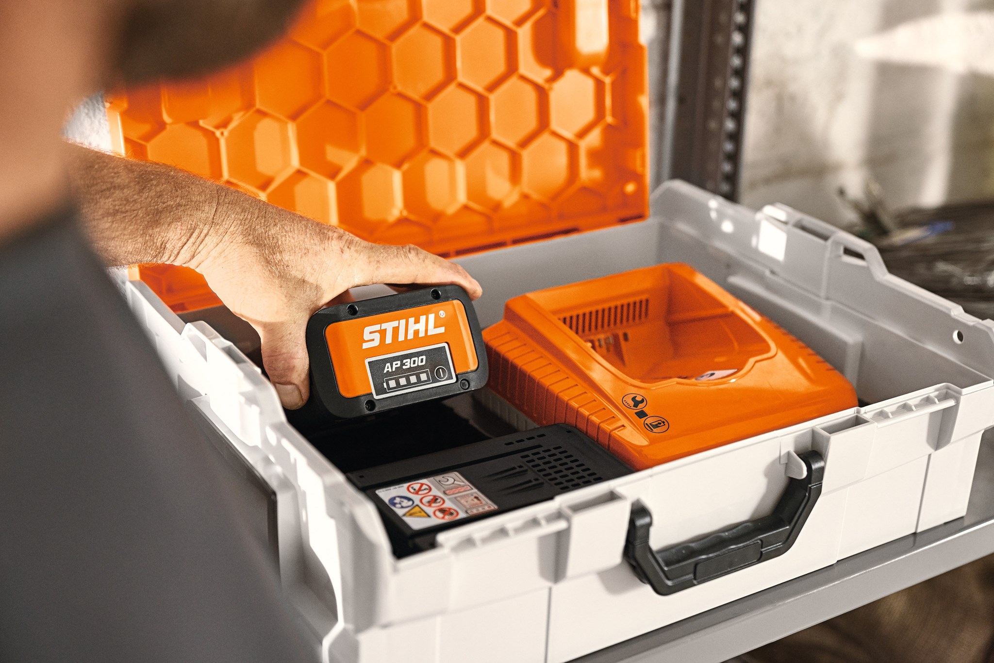 Kovček za akumulatorski pribor velikosti S ponuja prostor za dve bateriji AP iz sistema STIHL AP in polnilnik baterij STIHL AL 301 ali STIHL AL 500.
