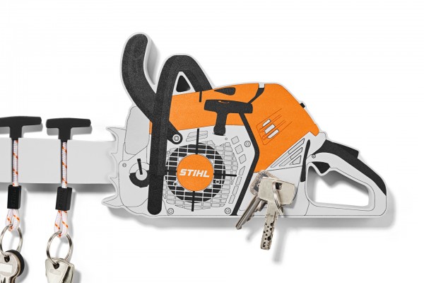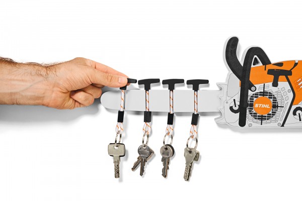 Nič več iskanja ključev! S tem držalom za ključe STIHL v obliki motorne žage boste v prihodnje zlahka našli vse ključe. Držalo je narejeno iz lesa in izdelana v slogu MS 500i. Integriran magnet v ohišju zagotavlja, da lahko ključe in druge lahke kovinske predmete postavite in ne odpadejo. Držalo za ključe vključuje tudi štiri kovinske obeske za ključe v videzu ročaja za zagon motorne žage.