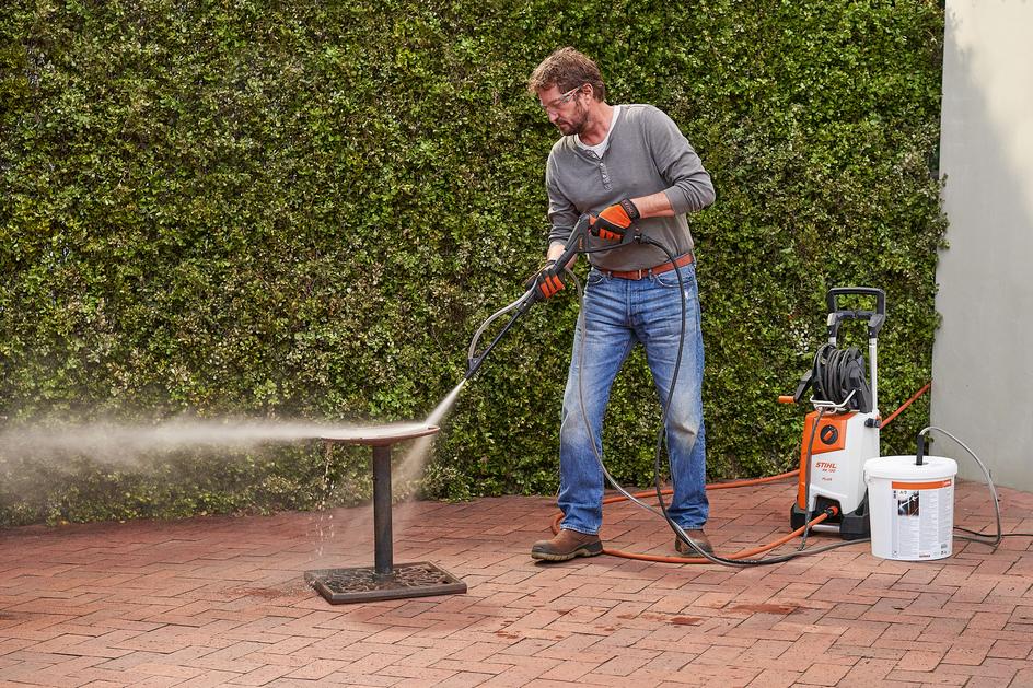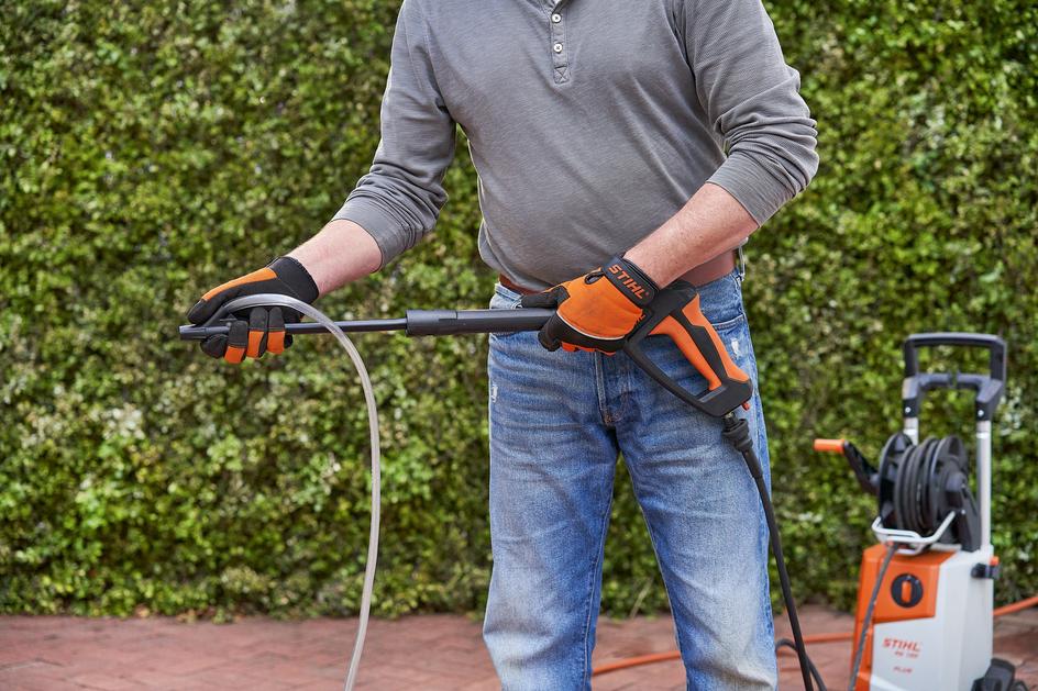 Delo z zmogljivimi napravami razveseljuje in omogoča, da pri tem prerastete samega sebe. Pri tem je dobro, če se lahko zanesete na učinkovita in varna zaščitna oblačila. Pri delu z visokotlačnimi čistilniki vedno nosite osebno zaščitno opremo. Sem spadajo npr. zaščitna očala, protizdrsni čevlji, zaščitne rokavice ipd. Več podrobnosti preberite v navodilih za uporabo kupljenega izdelka. Pred prvo uporabo naprave se dobro seznanite z njenim delovanjem, poleg tega se pred vsakim delom prepričajte, da je naprava v brezhibnem stanju. Specializirani trgovec STIHL bo napravo za vas pripravil na prvo uporabo in vam svetoval glede zaščitnih oblačil, krojev in konfekcijskih številk, pri tem pa boste oblačila lahko v miru pomerili. Zapomnite si, da osebna zaščitna oprema ne more nadomestiti varne delovne tehnike.