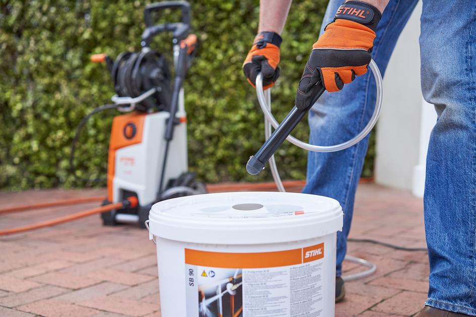 Za peskanje z visokotlačnim čistilnikom priporočamo uporabo kompleta za mokro peskanje. Ta je na voljo kot dodatna oprema za vse visokotlačne čistilnike STIHL in se namesto šobe namesti na brizgalno cev.