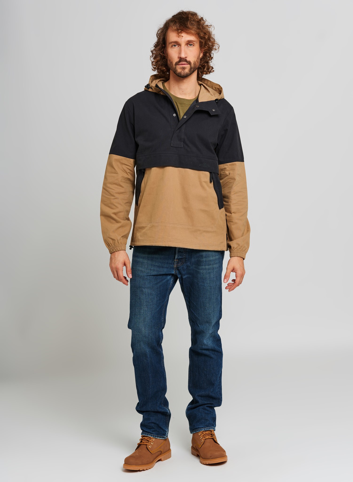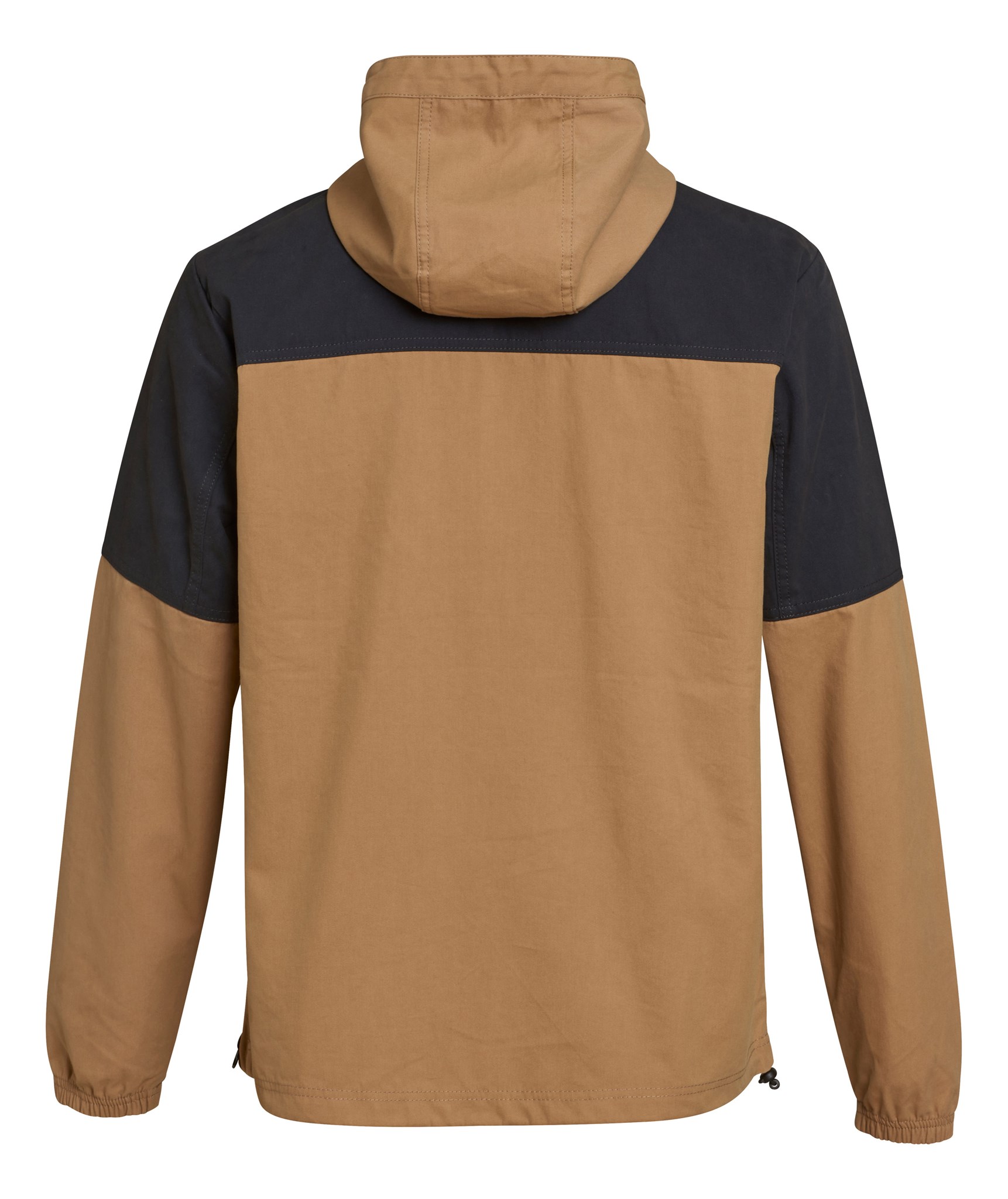 Eleganten: jakna v dvobarvnem dizajnu s kontrastno kapuco in vrvico, v širšem kroju. Polovična zadrga in dva praktična stranska žepa, našitek iz plute na zadnji strani in vezena ikona motorne žage na sprednji strani.
