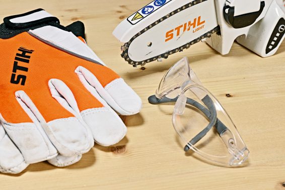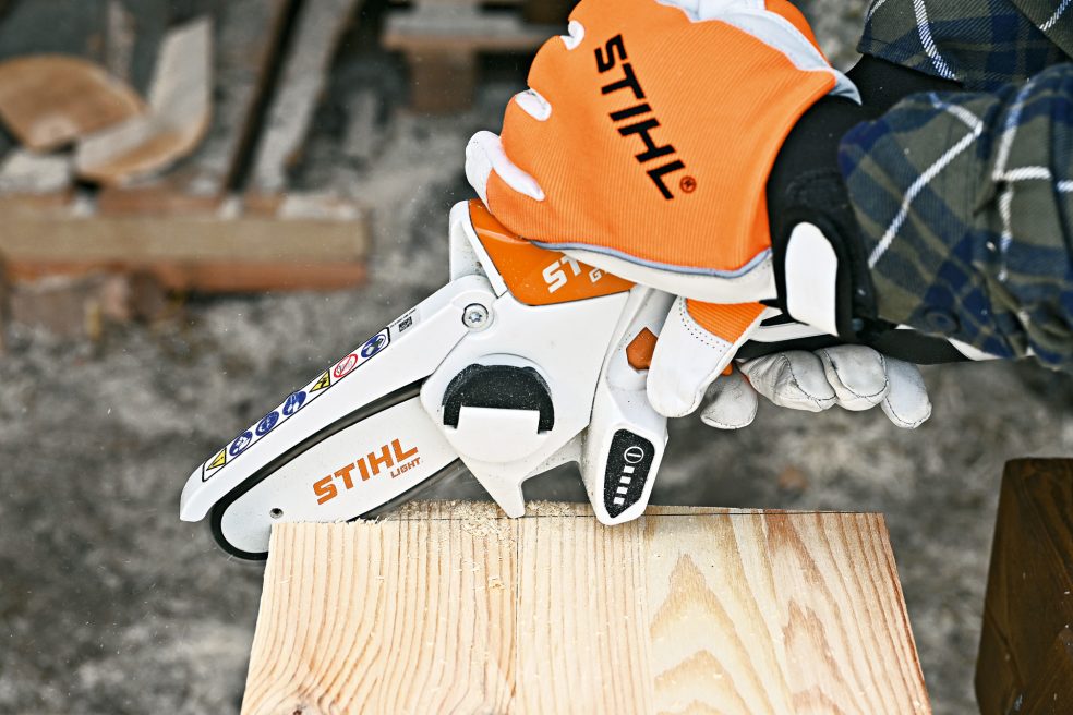 Delo z zmogljivimi napravami razveseljuje in omogoča, da pri tem prerastete samega sebe. Pri tem je dobro, če se lahko zanesete na učinkovita in varna zaščitna oblačila. Pri delu z enoročno akumulatorsko žago vedno nosite osebno zaščitno opremo. Sem sodijo zaščitna očala, rokavice iz trpežnega materiala, hlače z zaščito pred rezi in veliko več. Več podrobnosti preberite v navodilih za uporabo kupljenega izdelka. Pred prvo uporabo naprave se dobro seznanite z njenim delovanjem, poleg tega se pred vsakim delom prepričajte, da je naprava v brezhibnem stanju. Specializirani trgovec STIHL bo napravo za vas pripravil na prvo uporabo in vam svetoval glede zaščitnih oblačil, krojev in konfekcijskih številk, pri tem pa boste oblačila lahko v miru pomerili. Zapomnite si, da osebna zaščitna oprema ne more nadomestiti varne delovne tehnike.
