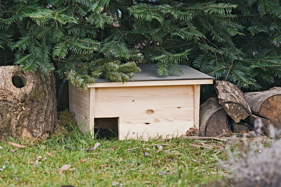 - Idealna lokacija za postavitev hiške za ježa je severna stran hiše, pod zimzelenim grmičevjem, drevesi ali pod napuščem. Vhod naj bo obrnjen stran od dežja.