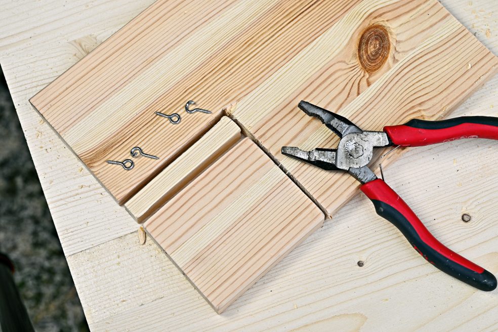 Dvoje ušesc s kleščami razprite. Dve zaprti ušesci privijte v viseča vrata in dve razprti v steno. Obesite vrata in s pomočjo klešč stisnite ušesci ponovno skupaj.