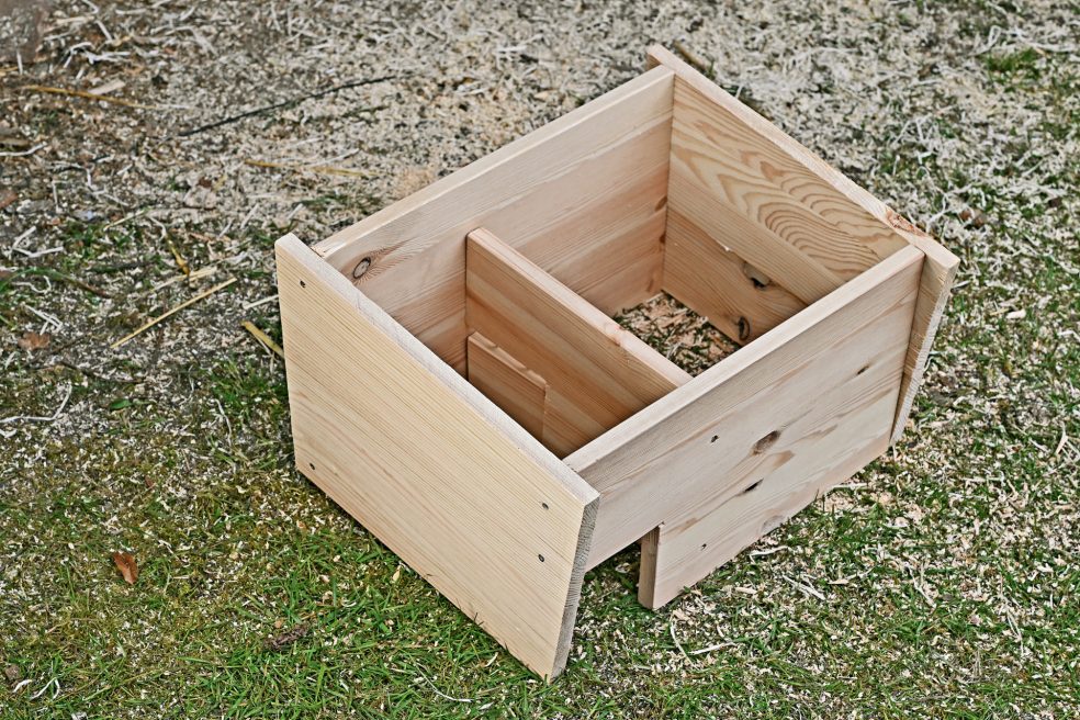 - Pri hiški brez tal pokrijte zemljo s prodom ali plastjo lesnih oblancev. Gnezdo bo tako suho in toplo.