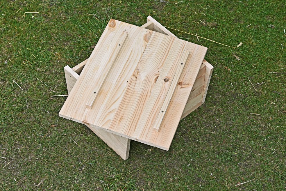 Da se streha hiške za ježa ne bo premikala, pribijte dve leseni deščici (kot kaže slika) na strešno ploščo. Za zaščito pred dežjem na streho z žeblji namestite vodotesno strešno lepenko. Z nanosom lanenega olja boste hiško za ježa dodatno zaščitili pred vremenskimi vplivi.