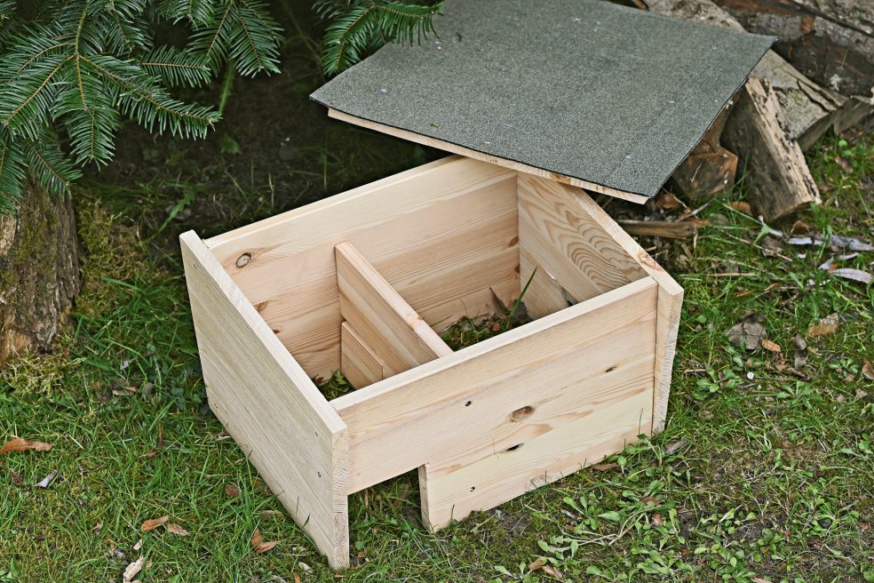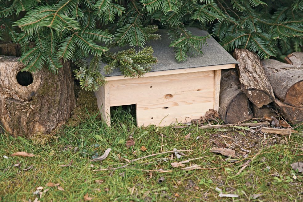 - Hiško za ježa postavite na ravna in suha tla in jo pokrijte z dračjem in odpadlim listjem.