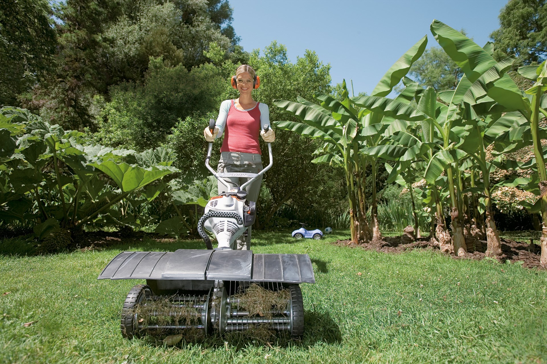 Odstranjuje mah in razraščene plasti s površine trate. Vključno z razširjenim ščitnikom in zaščito. Delovna širina 50 cm, teža 8,3 kg.