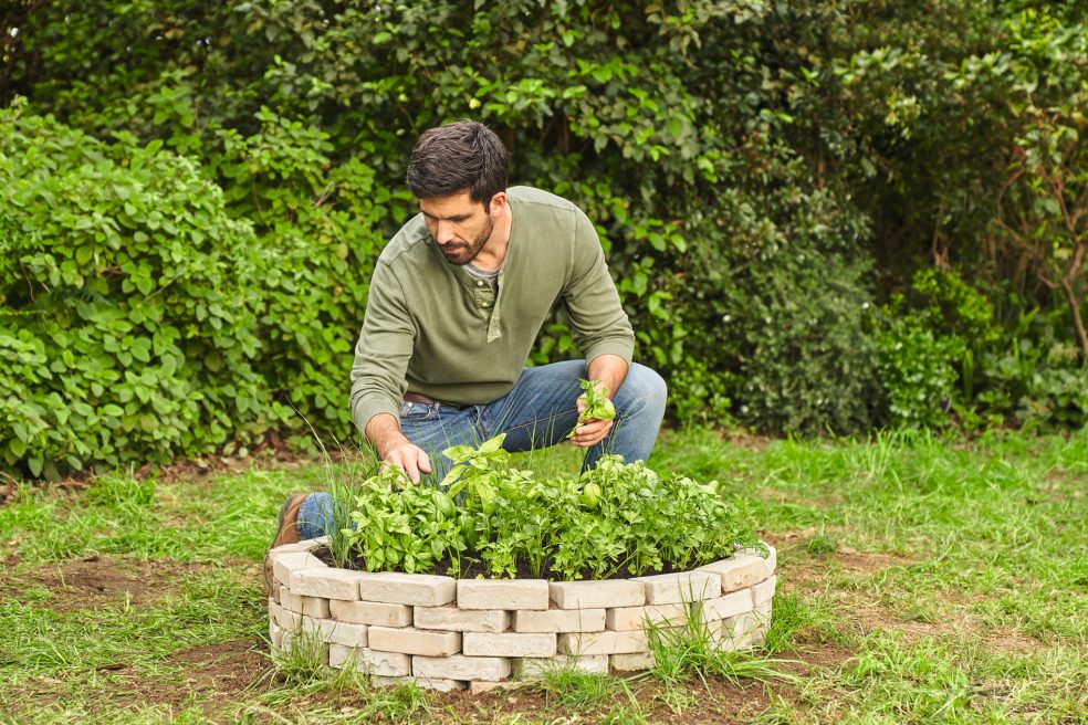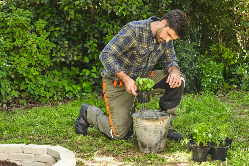 Preden zasadite zelišča (ali cvetlice), jih najprej omočite. To storite tako, da koreninski del potopite v vedro vode. Počakajte, da ne vidite več zračnih mehurčkov, ki se dvigujejo na površino. Nato sadike prestavite v zemljo. Z rokami naredite luknjo v zemljo, vstavite sadiko in potlačite zemljo okoli nje. Zdaj ostane samo še zalivanje in že imate lepo pripravljeno gredo z zelišči.
