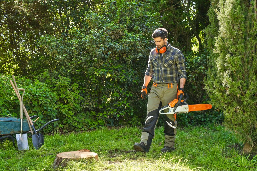 Delo z zmogljivimi napravami razveseljuje in omogoča, da pri tem prerastete samega sebe. Pri tem je dobro, če se lahko zanesete na učinkovita in varna zaščitna oblačila. Pri delu z enoročno akumulatorsko žago vedno nosite osebno zaščitno opremo. Sem spadajo npr. zaščitna očala, zaščitne rokavice ipd. Več podrobnosti preberite v navodilih za uporabo kupljenega izdelka. Pred prvo uporabo naprave se dobro seznanite z njenim delovanjem, poleg tega se pred vsakim delom prepričajte, da je naprava v brezhibnem stanju. Specializirani trgovec STIHL bo napravo za vas pripravil na prvo uporabo in vam svetoval glede zaščitnih oblačil, krojev in konfekcijskih številk, pri tem pa boste oblačila lahko v miru pomerili. Zapomnite si, da osebna zaščitna oprema ne more nadomestiti varne delovne tehnike.