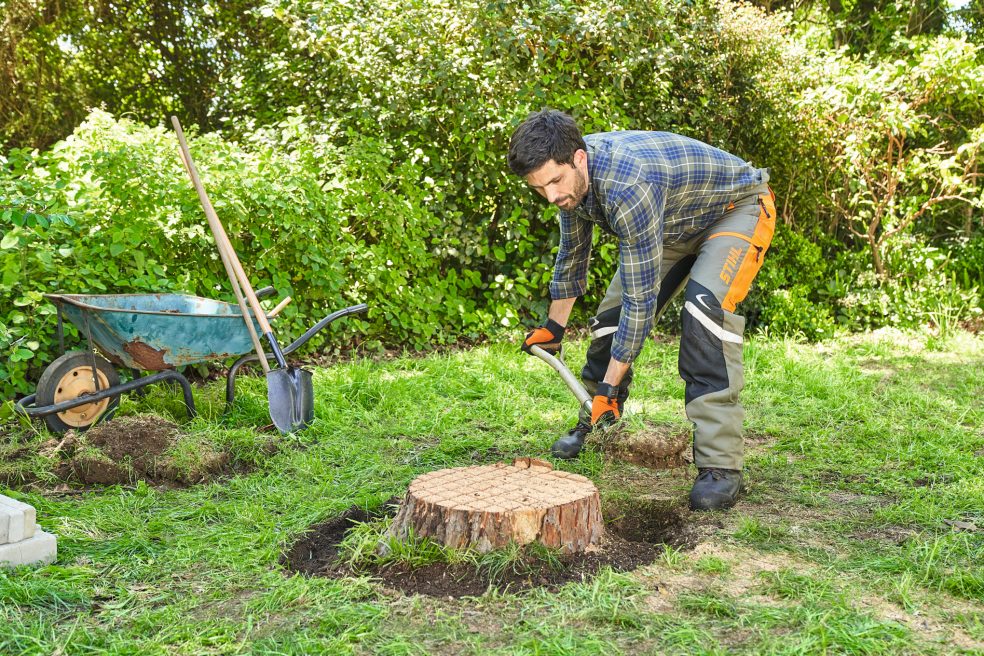 Če želite štor izkopati, to opravite v suhem vremenu. Mokra zemlja se bo namreč oprijemala vašega vrtnega orodja in vam znatno otežila delo. Predvsem pri globokih koreninah predvidite več časa za odstranjevanje. Pri odstranjevanju korenin si lahko pomagate z zložljivo žago STIHL PR 16, lopato in s sekiro.