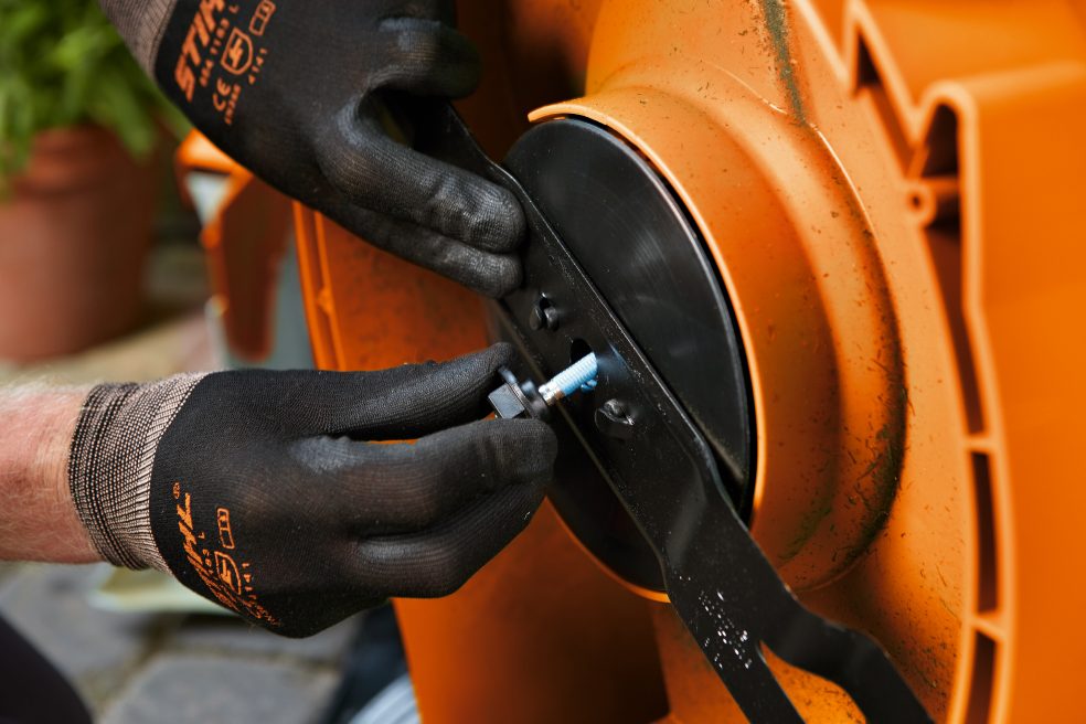 Vijaki noža kosilnice imajo desni navoj, tako da jih odvijate v nasprotni smeri urnega kazalca. Zelo pomembno: pri odvijanju vijaka imejte vedno nataknjene rokavice. Pri odvijanju boste namreč morali z eno roko držati nož, z drugo pa boste odvijali vijak. Če boste imeli težave, naj vam nekdo pomaga in pridrži nož, ali pa nož zablokirajte z leseno klado.