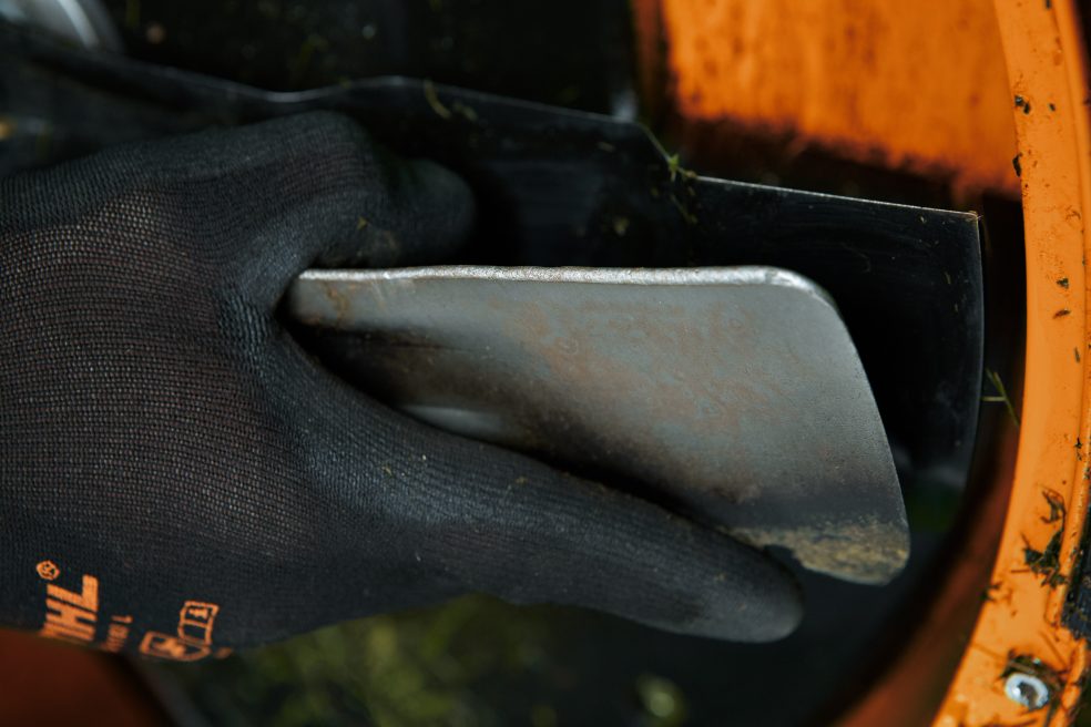 Nož pred ostrenjem temeljito očistite in odstranite ostanke trave. Pri tem uporabite lopatico ali žično krtačo. Priporočamo tudi vizualen pregled: če opazite razpoke ali zareze, morate nož zamenjati.