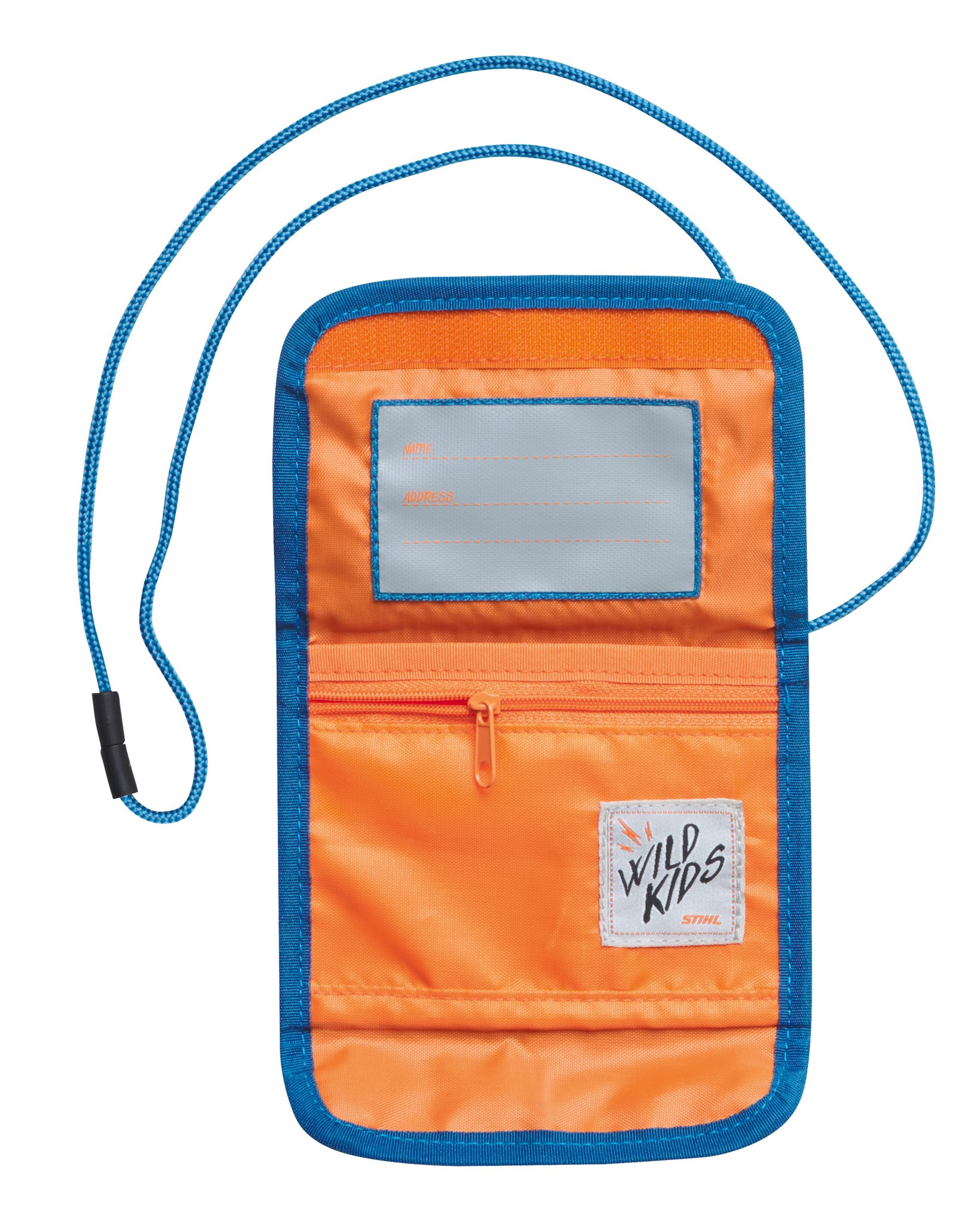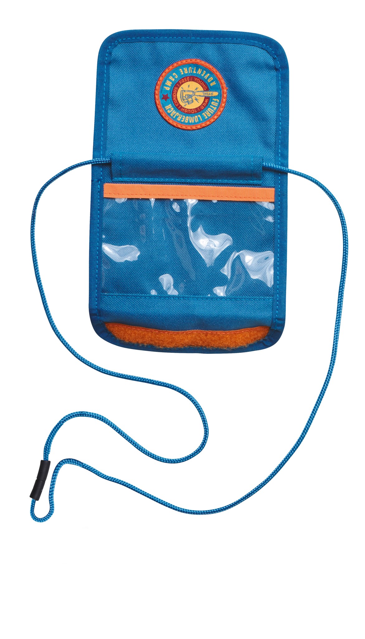 Da otroci pri odkrivanju sveta ne bodo izgubili denarnice, je otroška denarnica Adventure opremljena z vrvico za okoli vratu in je žepnina na varnem. Modre barve z živahnim našitkom zunaj ter oranžne barve v notranjosti.