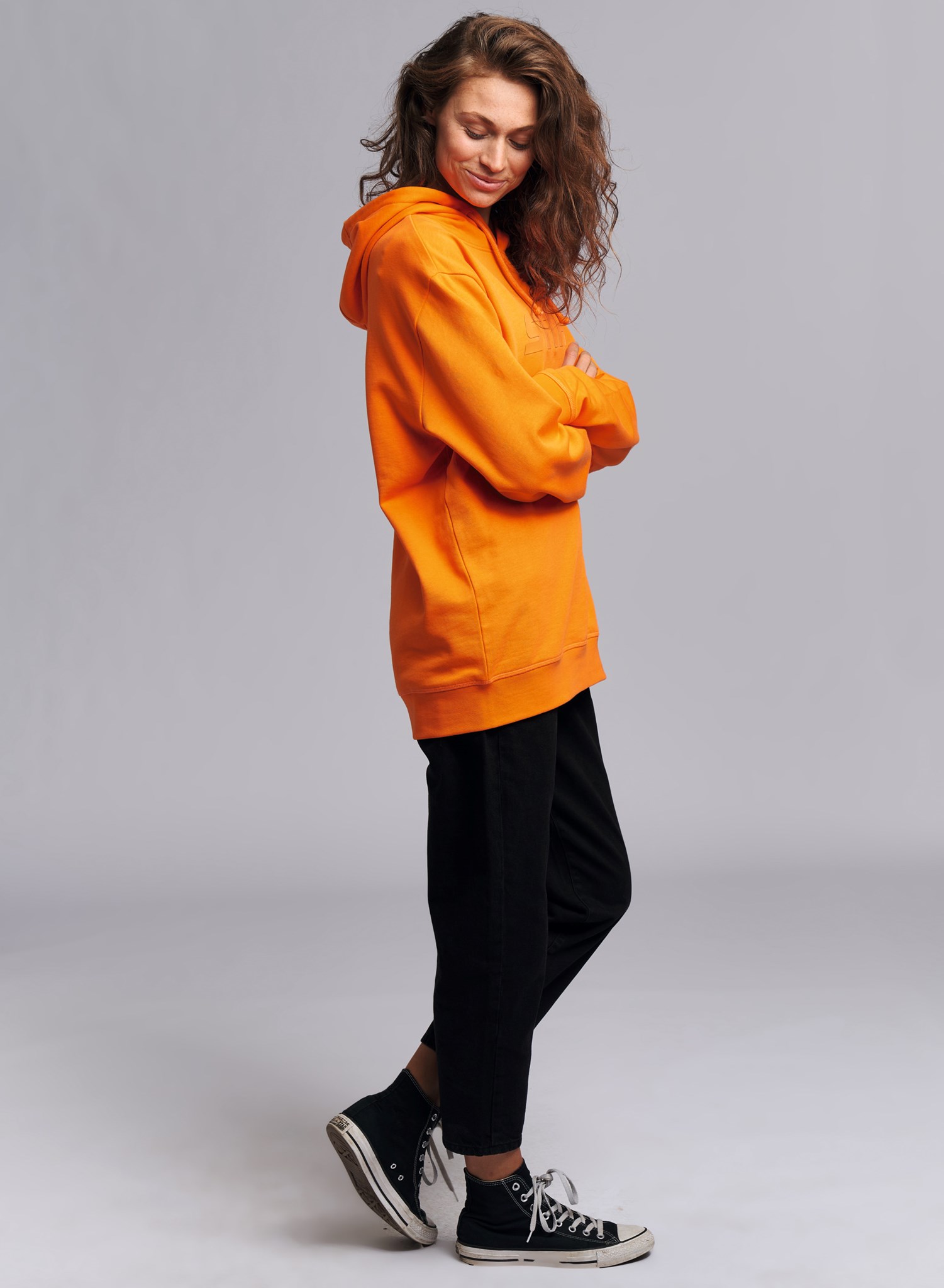 Oranžna barva v psihologiji velja za barvo, ki izboljšuje razpoloženje. Res ne moreš biti slabe volje, ko vidiš pulover s kapuco v signalno oranžni barvi. Z velikim logotipom na prsih.