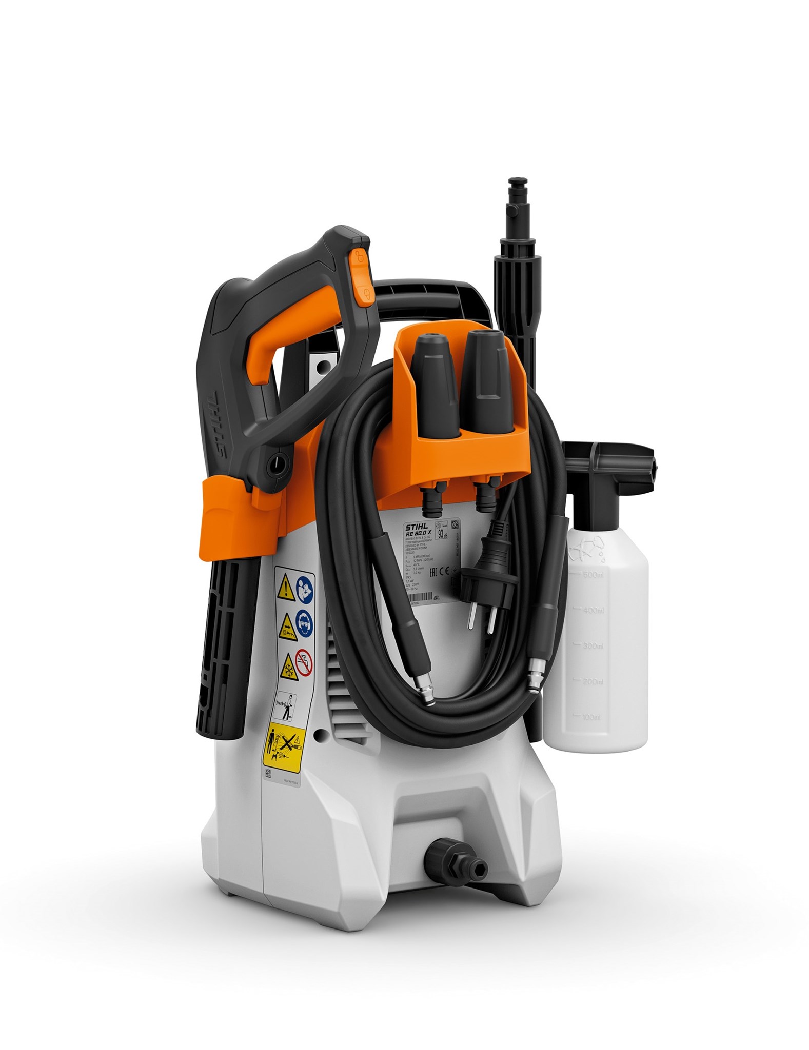 Električni visokotlačni čistilnik STIHL RE 80 X je še posebej priročen zaradi svoje majhne teže in kompaktne oblike. Robustna visokotlačna črpalka z aluminijasto glavo ustvari največji tlak 120 barov. Tako lahko učinkovito in temeljito opravite čiščenje okoli hiše. Dve standardni šobi omogočata izvajanje različnih čistilnih nalog. Nastavljiva ploščata šoba je primerna za hitro čiščenje občutljivih površin, vrtljiva šoba pa z močnim točkovnim curkom učinkovito odstrani tudi trdovratno umazanijo. Poleg tega lahko uporabite priloženi komplet pršil za čistilna sredstva, da dosežete še boljše rezultate čiščenja. 5 m dolgo visokotlačno cev lahko hitro priključite na ohišje in pištolo s pomočjo hitrih spojk. Po čiščenju lahko visokotlačno cev in standardne dodatke pospravite neposredno na napravo. Z dodatki, kot je komplet za čiščenje vozila, lahko svoje vozilo očistite tudi s STIHL RE 80 X.