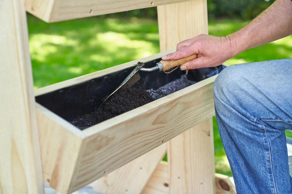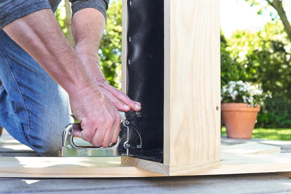 Korita obložite s folijo, prepognite rob folije in folijo ob dolgih stranicah spnite. Nad luknjami za odtok vode naredite zareze v folijo.