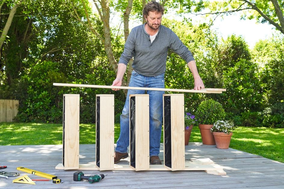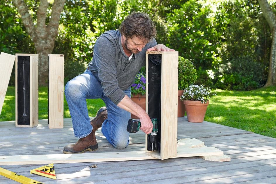 Zdaj postavite korita pokonci in jih enega za drugim privijačite skozi čelne stranice.