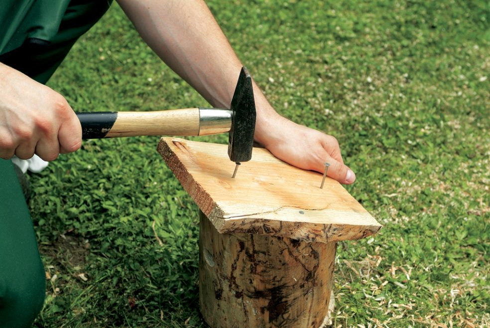 Z očesnimi vijaki najprej na deblo pritrdite vnaprej zažagano dno. Zatem namestite še streho. Pazite, da bo streha nekoliko daljša, tako da dež ne bo tekel v notranjost hišice.
