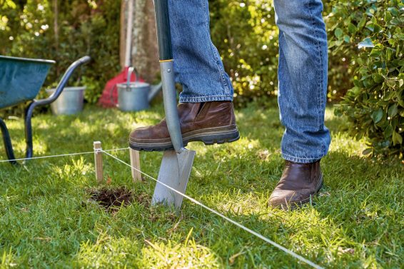 Najprej označite območje, kjer bo postavljena visoka greda Nato z lopato izkopljite zgornjih 10 centimetrov trate.
