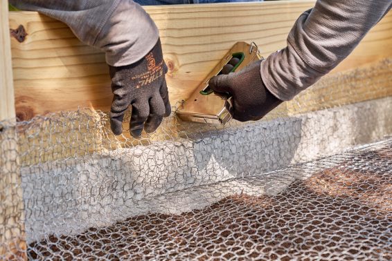 Mrežo položite na tla visoke grede tako, da sega čez rob kamna. Če je žica previsoka, jo preprosto odrežite ali upognite. Nato žico s sponkami pritrdite na lesene deske. Nato privijte preostale lesene deske na stebre, dokler zadnja deska ni poravnana z lesenimi stebri.