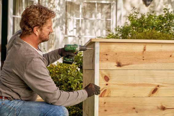 Lesene deske namenjene za stranske stene visoke grede z žago za les odrežite na želeno dolžino. Nato lesene deske pritrdite na stebre z vijaki in akumulatorskim izvijačem. Najprej pritrdite samo spodnjo vrsto desk.