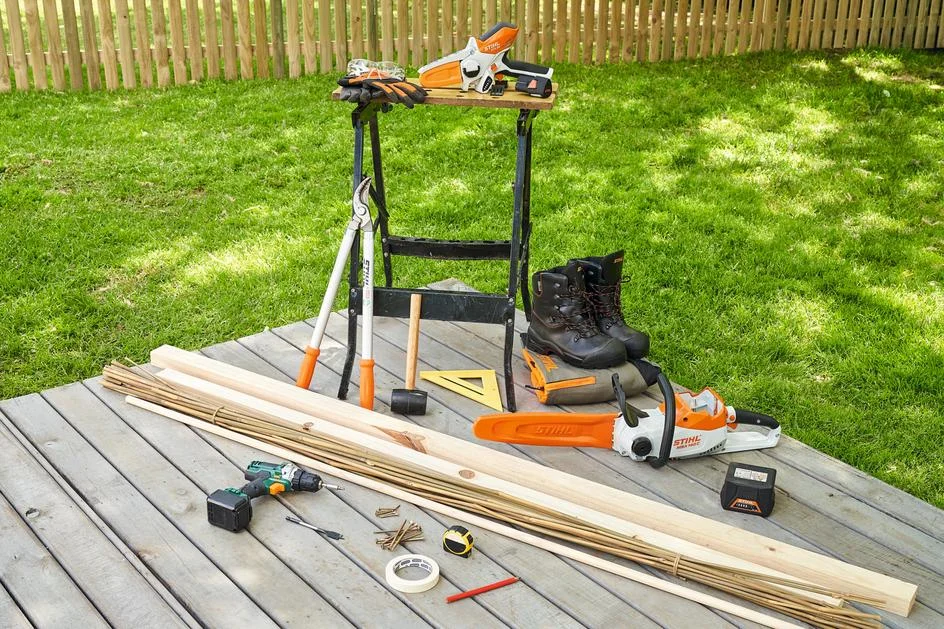Kot material bomo uporabili bambusove palice dolge dobra dva metra. Te lahko dobite v trgovini z vrtnimi pripomočki ali iz lastnih bambusovih rastlin, če jih močno porežete. Kot alternativo lahko uporabite tudi leskove veje in druge vrste podobnega lesa. Upoštevajte, da lahko grmovnice zaradi varstva ptic redčite le od marca do oktobra, vendar jih tudi takrat ne smete korenito obrezati.