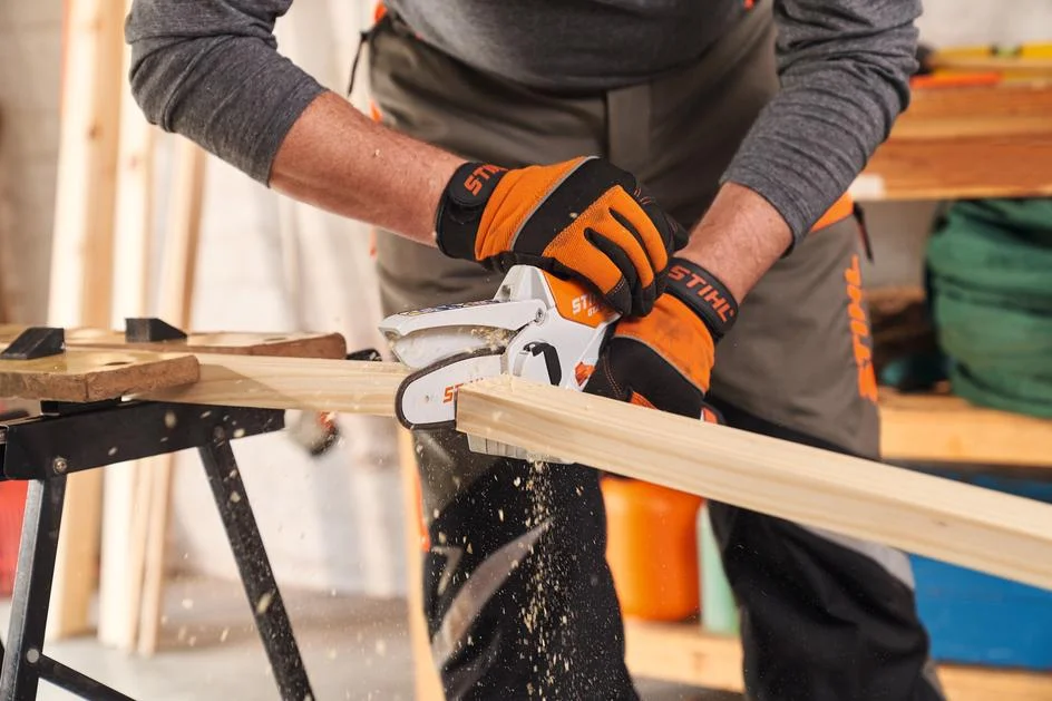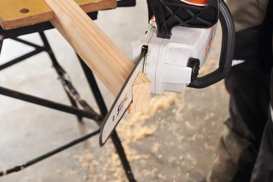 Poteka žaganje pravokotnih letev z akumulatorsko žago STIHL MSA 70, ki se bodo uporabile za noge za zaščito pred pogledi.