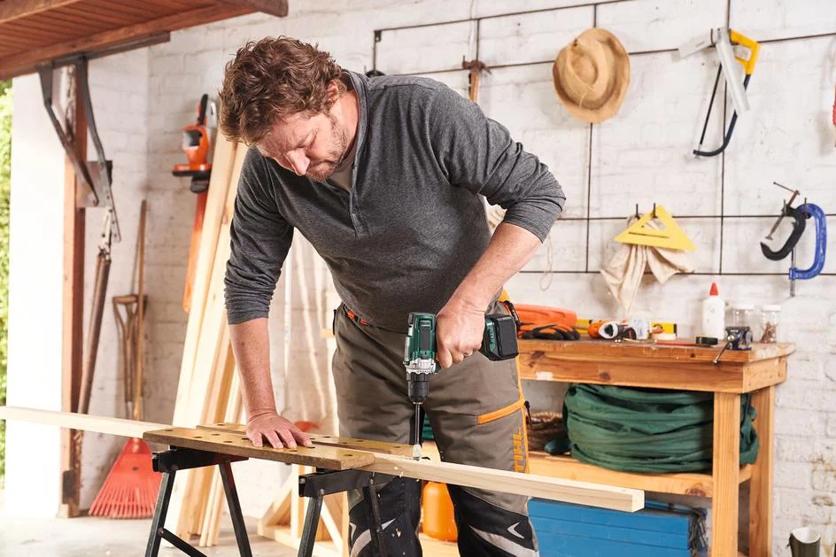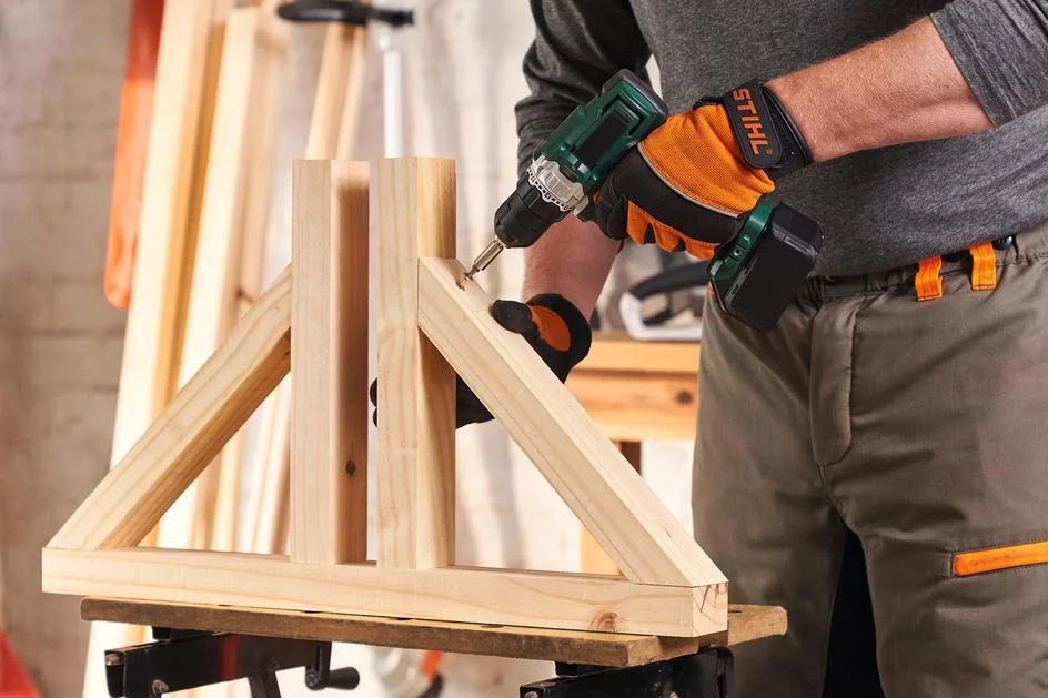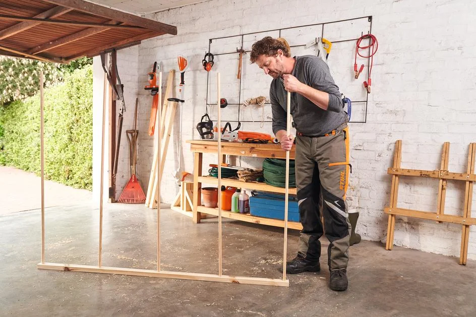 Najprej na dolžino odrežite letve okvirja. To storite tako, da na približno 45 x 28 mm velikih letvah izmerite 2 x 180 cm in 2 x 140,5 cm. Letve vpnite v delovno mizo in z enoročno akumulatorsko žago STIHL GTA 26 odrežite letve okvirja na potrebno dolžino.