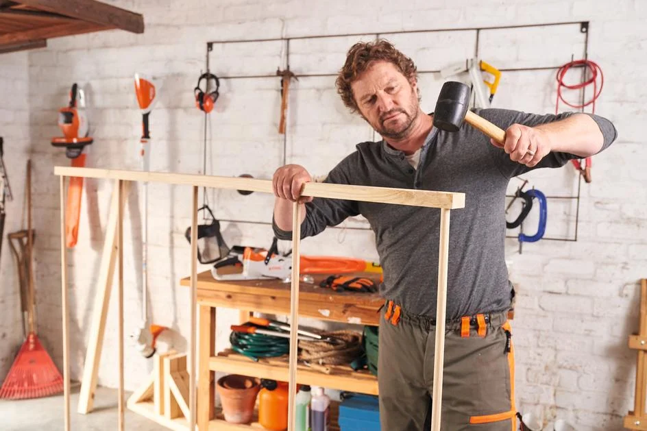 Na tla položite prvo letev z vstavljenimi palicami. Nato na palice položite drugo letev okvirja in nanjo udarjajte z gumijastim kladivom, da se lepo usede. Nato palice z zunanje strani privijte z vijaki 3 x 50 milimetrov. Tako bo okvir še bolj stabilen.