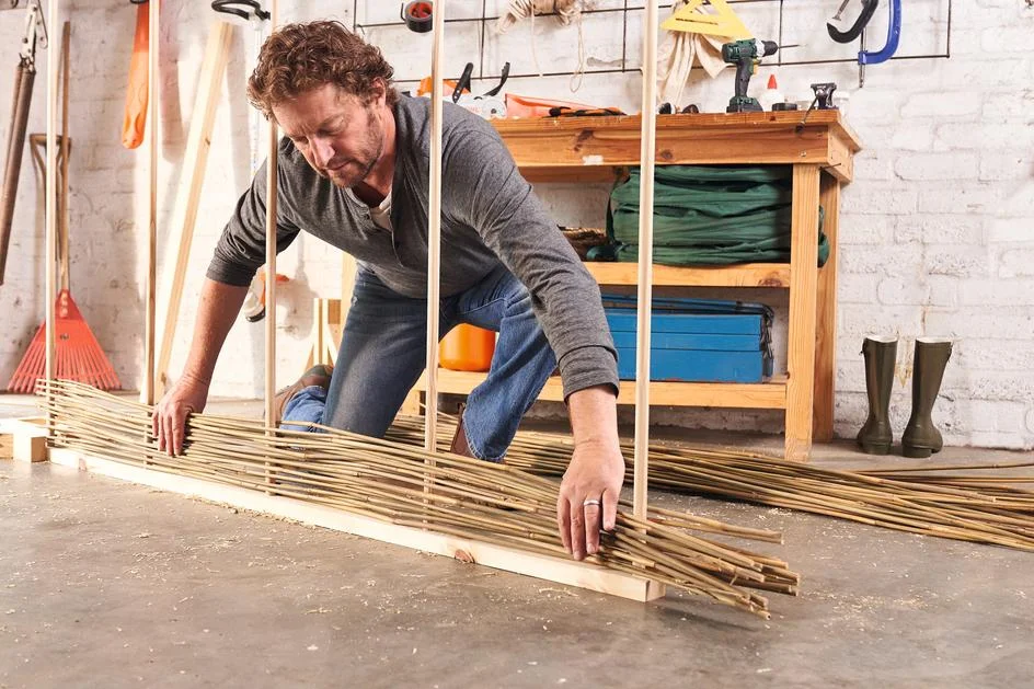 Zdaj pritrdite obe 140,5 cm dolgi letvi okvirja. Ti ohranjata obliko bambusovih palic in hkrati zagotavljata skladen videz.