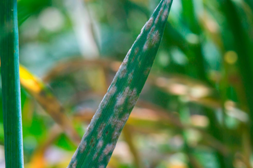 | Simptom | Pojav pepelaste plesni se kaže z belimi, mokastimi oblogami na površini travnih bilk. |
