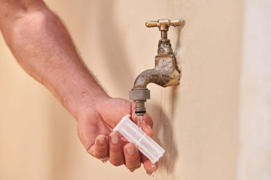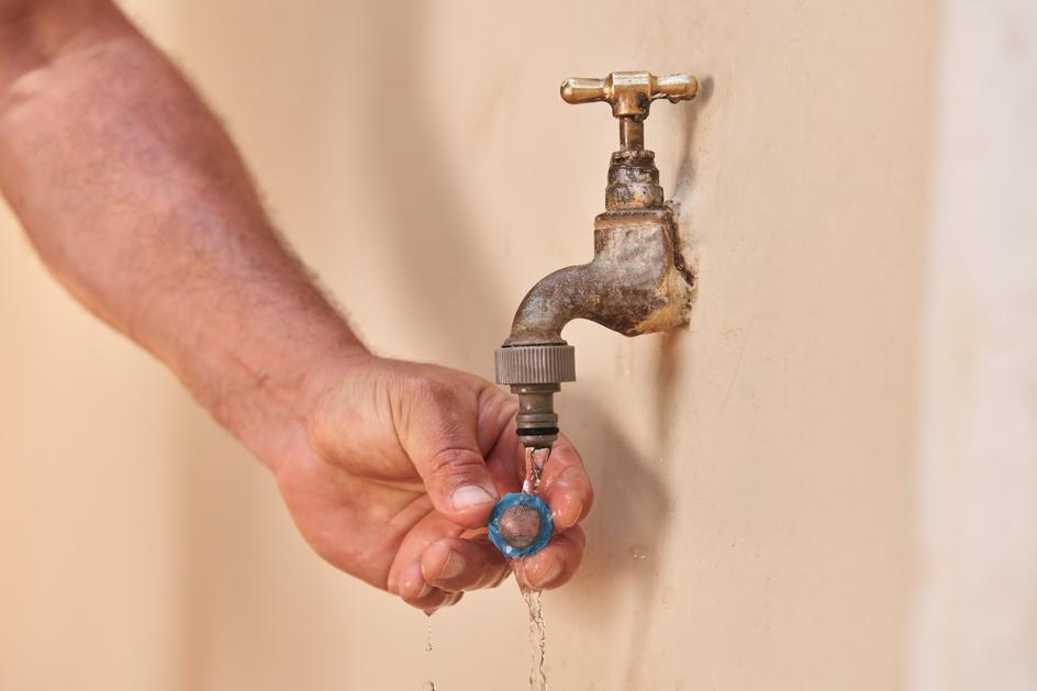 Redno preverjajte sito za dovod vode na umazanijo. V ta namen odvijte cevni nastavek vodnega priključka in snemite sito za dovod vode. Sito sperite pod tekočo vodo in ga ponovno namestite. Nato cevni nastavek ponovno dobro privijte.