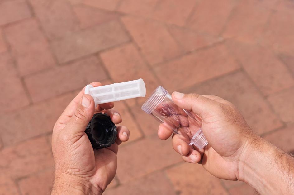Sredstvo proti zmrzovanju zamešajte v skladu z navodili za uporabo in ga natočite v čisto posodo. V to posodo potopite vodno cev, pritisnite ročico razpršilne pištole in jo držite pritisnjeno.
