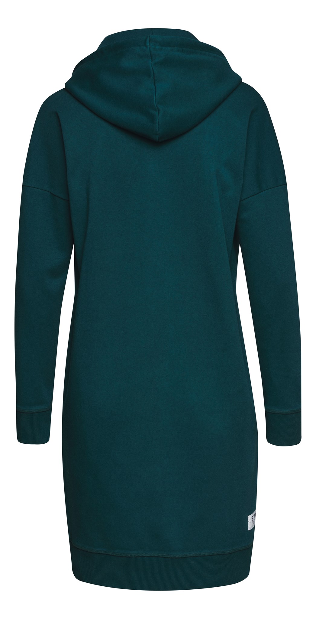 Odpravite se v mesto s to sproščeno, lahko obleko s kapuco v zeleni barvi. Z rebrastimi manšetami na rokavih in na pasu, velikim sprednjim žep v obliki kenguruja - za samostojno nošenje ali za kombiniranje s kratkimi hlačami, pajkicami ali kavbojkami.